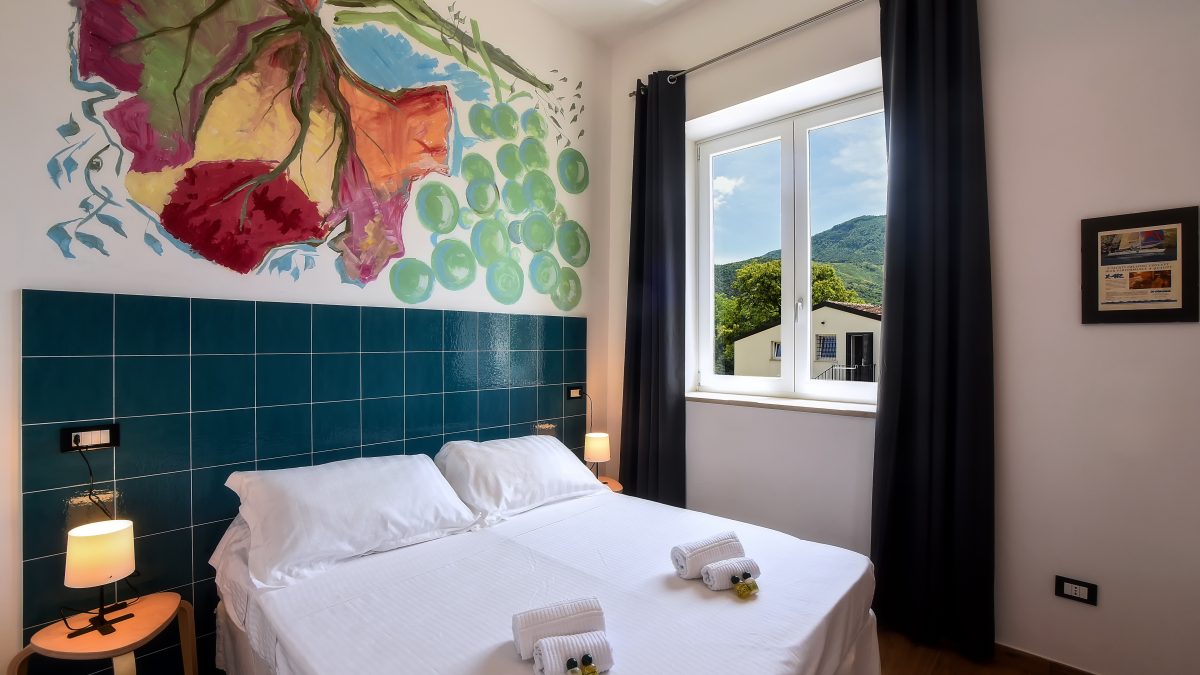 Scopri la magia della camera “Acquamela”, un luogo dove comfort e raffinatezza si incontrano per offrirti un soggiorno indimenticabile. La finestra si affaccia sulla corte e su filari di vite, regalando una vista incantevole che cambia colore con le stagioni.