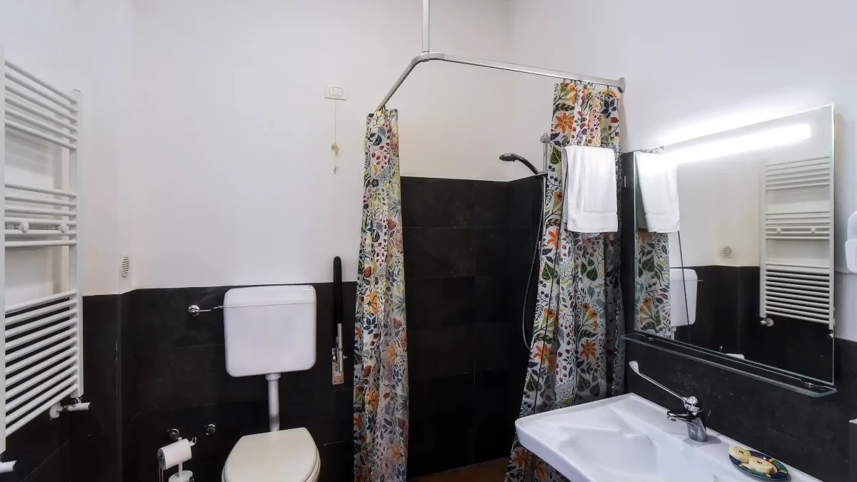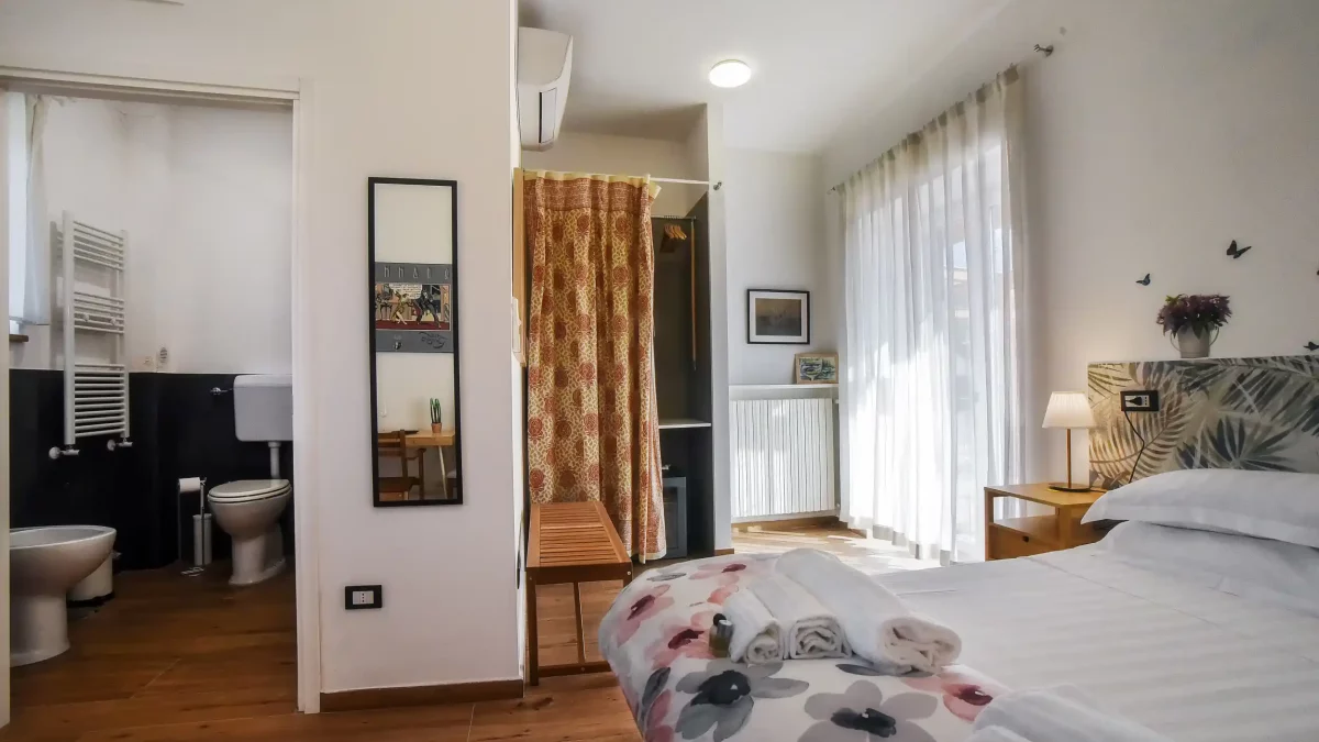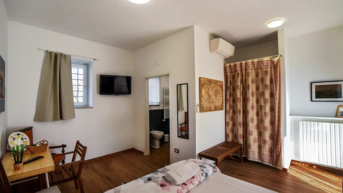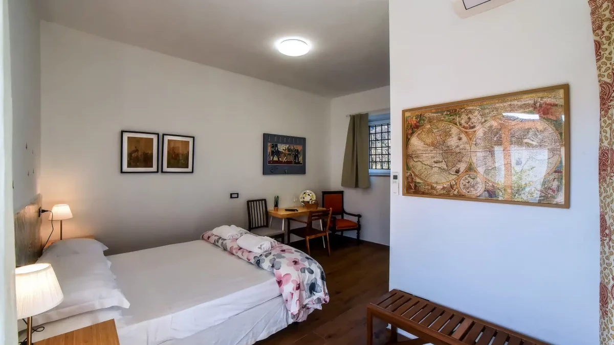 Un ambiente luminoso e comodo con una divisione degli spazi ben organizzata. La camera è aperta verso la corte e gli altri servizi dell’azienda, la vigna, la cantina, il ristorante, la piscina.