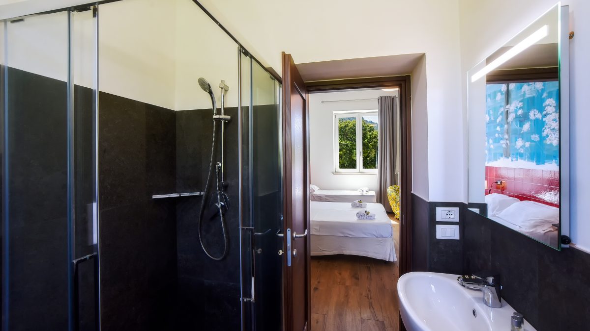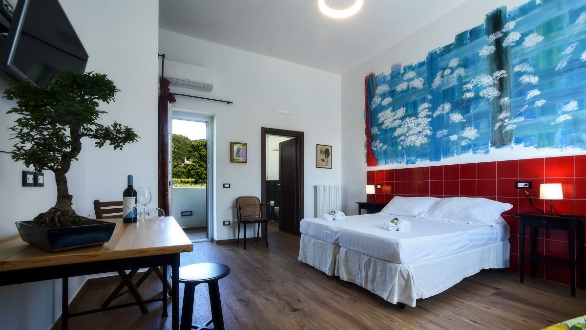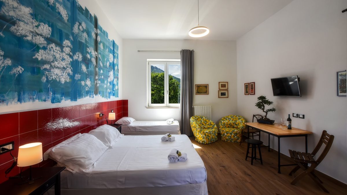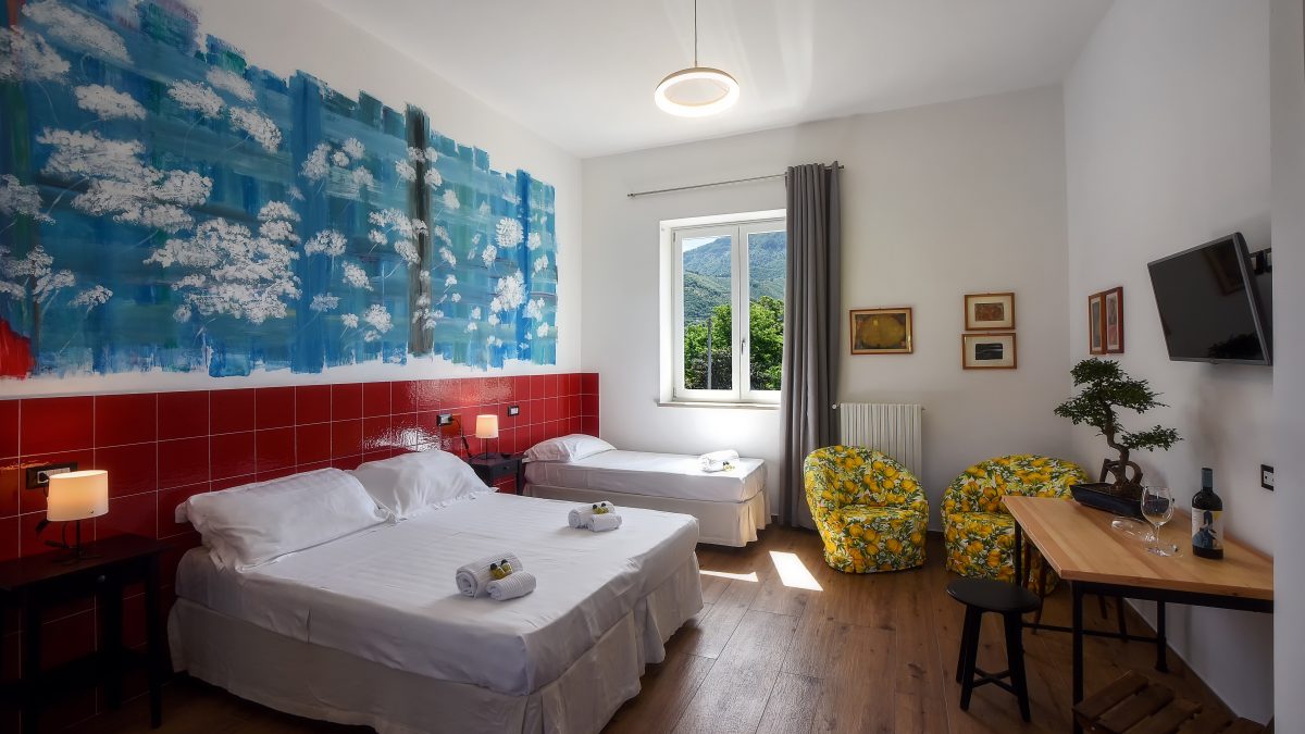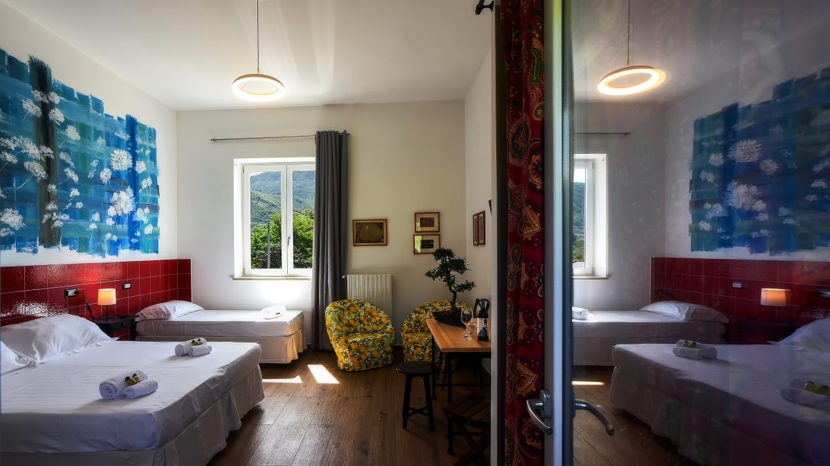 La camera “Diecimare” è arredata con colori tenui e dettagli floreali che creano un’atmosfera serena e rilassante. Un comodo letto matrimoniale, un letto singolo e un accogliente angolo lettura ti invitano a lasciarti andare al relax.